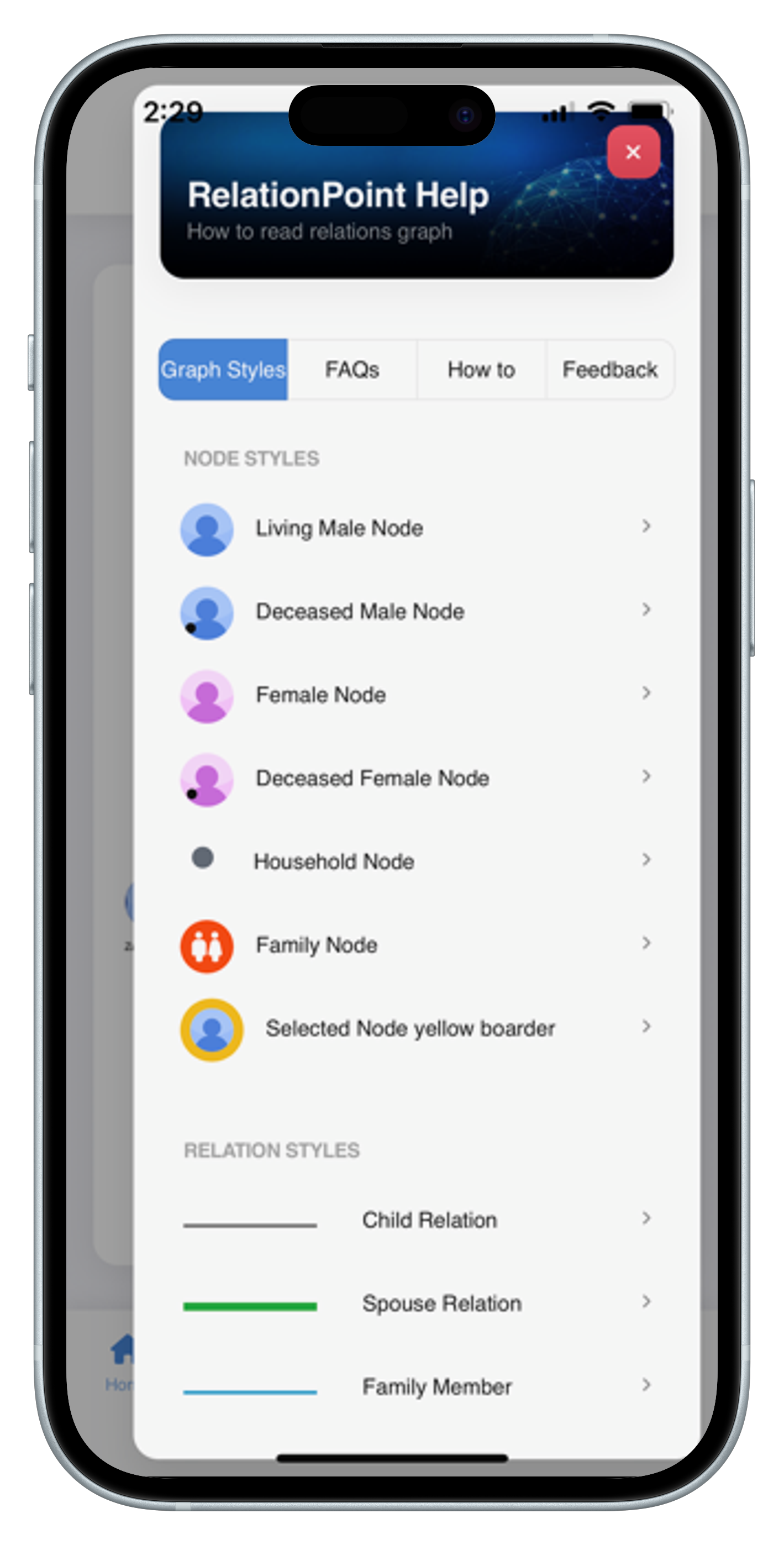 The help section will guide you on how to read RelationPoint graph styles. What every node represents and what every relation means. The how to section will show you how to add a person node, household node, family node and how to search and edit these nodes. You will also be able to send your feedback right from the application itself.
